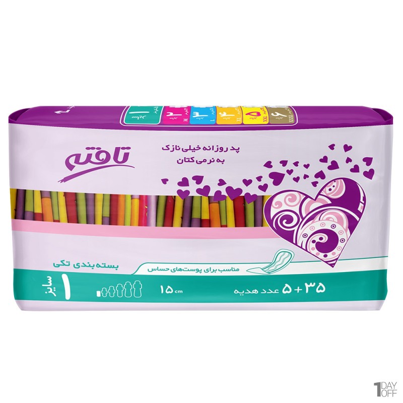 همه خانمها در دوران قاعدگی خود به استفاده از لوازم بهداشتی مخصوص مانند نوارهای بهداشتی یا تامپون احتیاج دارند. معمولا نوار بهداشتی یکی از در دسترسترین محصولات بهداشتی است که در این دوران توسط خانمها مورد استفاده قرار میگیرد و با قدرت جذب بالای خود حس آرامش و راحتی به آنها میدهد. پد روزانه خیلی نازک تافته سایزی کوچک و قدرت جذب بالایی دارد و مناسب با پوستهای حساس طراحی شده است. این محصول قطر خیلی کمی دارد، بسیار نازک بوده و از مرطوب شدن لباس جلوگیری میکند. پد روزانه پوست حساس تافته ضدحساسیت بوده، از بروز تحریکات پوستی و خارش در نواحی حساس بدن جلوگیری میکند و برای استفاده روزانه مناسب است. پد روزانه تافته رویهای به نرمی کتان دارد، جاذب ترشحات روزانه بوده و با دارا بودن پودر جاذب ضدبو در جلوگیری از بوی نامطبوع و بیماریهای عفونی موثر عمل میکند. این محصول آنتی باکتریال بوده، از لحاظ درماتولوژی تایید شده است و هر بسته آن شامل 40 عدد پد بهداشتی است.